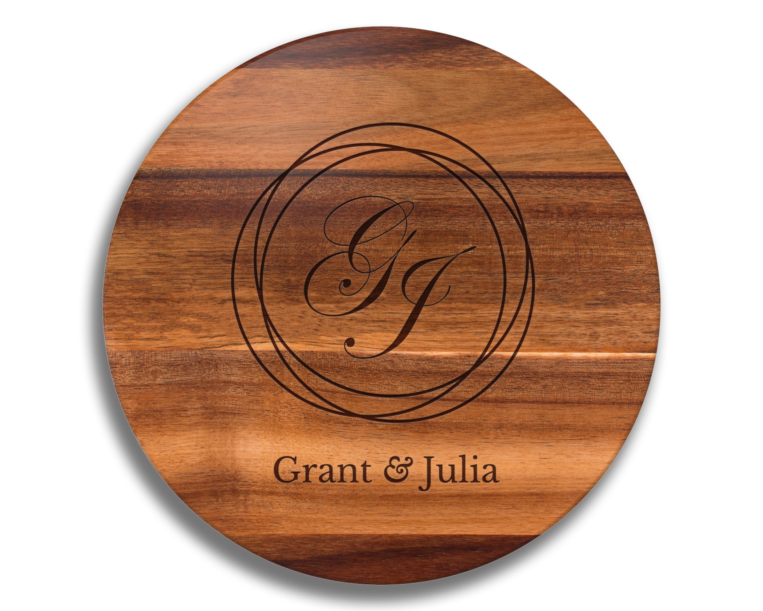 This is an amazing Personalized lazy Susan! It is a beautiful and generously sized 18" solid Acacia wood Lazy Susan, and it is the perfect way to celebrate your family and heritage. Acacia wood is a lovely dark wood, very in style! It features a laser etched and engraved design in a gorgeous rustic and yet refined board.