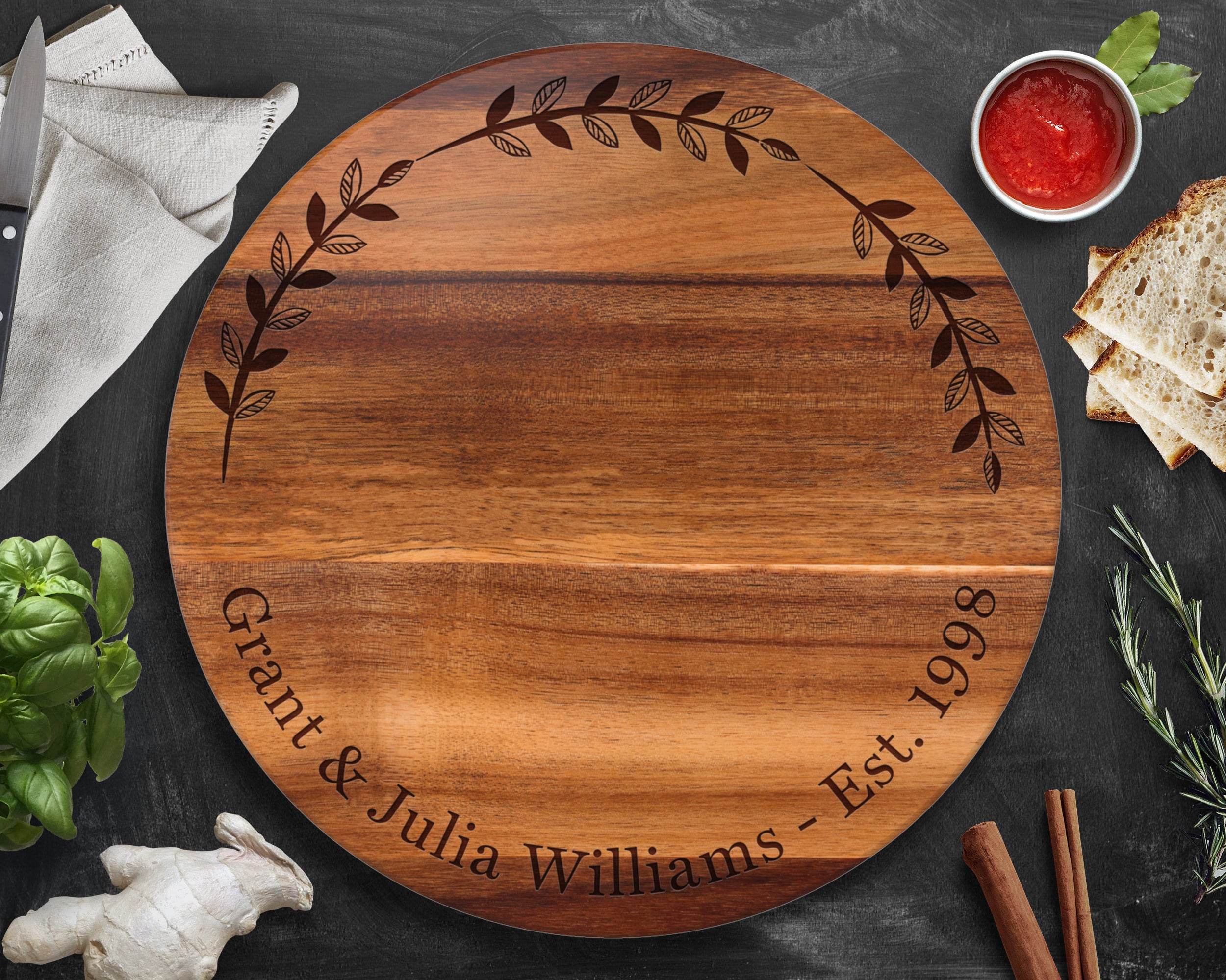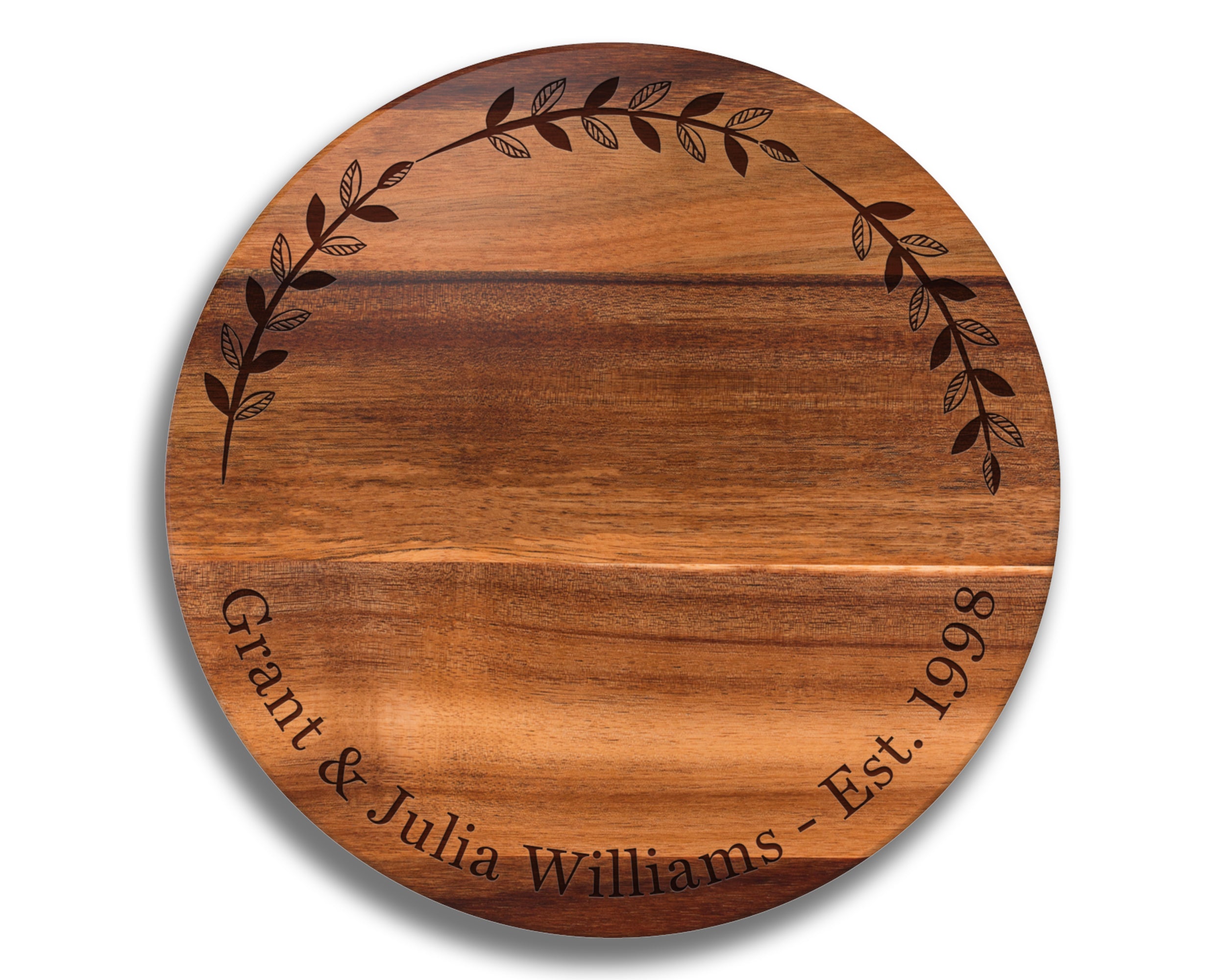This is an amazing Personalized lazy Susan! It is a beautiful and generously sized 18" solid Acacia wood Lazy Susan, and it is the perfect way to celebrate your family and heritage. Acacia wood is a lovely dark wood, very in style! It features a laser etched and engraved design in a gorgeous rustic and yet refined board.